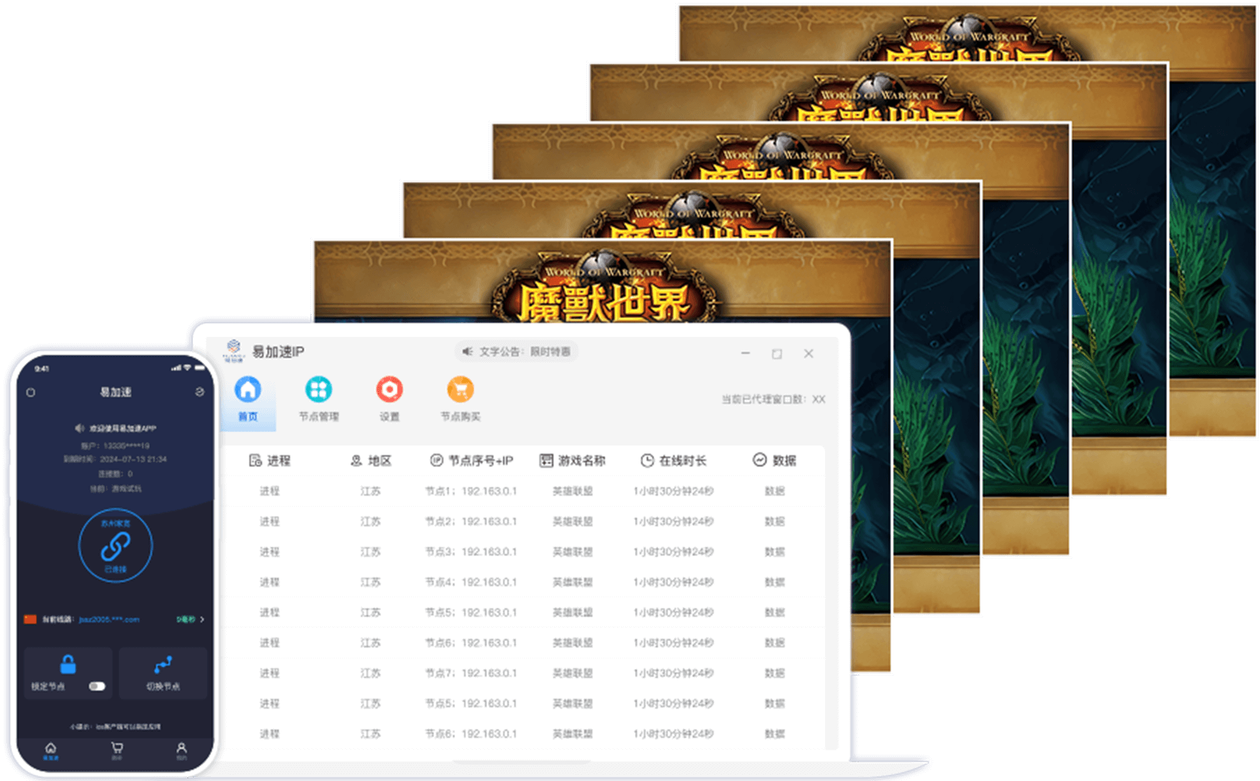 易加速机房遍布全国 各地城市,全网第一的地区 覆盖量,随机拨号线路, 24小时不间断供应
